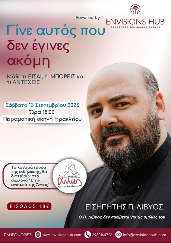 Με τη χαρακτηριστική του προσέγγιση που συνδυάζει αυτογνωσία, πνευματικότητα και ψυχολογική ενσυναίσθηση, ο π. Λίβυος θα μιλήσει για τους φόβους που μας κρατούν πίσω, για τα λόγια που λέμε στον εαυτό μας και για τη δύναμη της προσωπικής αλλαγής.