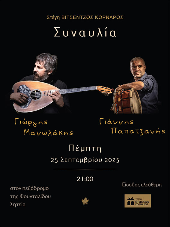 Η Στέγη ΒΙΤΣΕΝΤΖΟΣ ΚΟΡΝΑΡΟΣ σας προσκαλεί σε μια ξεχωριστή μουσική βραδιά με τον Γιώργη Μανωλάκη (λαούτο, φωνή) και τον Γιάννη Παπατζανή (κρουστά). Την