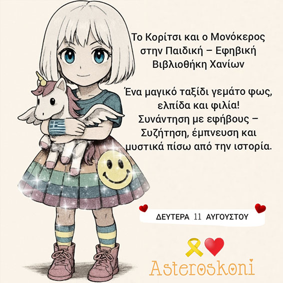 Αυτόν τον Αύγουστο, στο πλαίσιο των καλοκαιρινών διακοπών στην Κρήτη, η Αστερόσκονη είχε τη χαρά να συναντηθεί με τους νέους συγγραφείς της Λέσχης Γραφής Εφήβων Λ.Ο.Γ.Ο.Υ. στη Δημοτική Βιβλιοθήκη Χανίων.