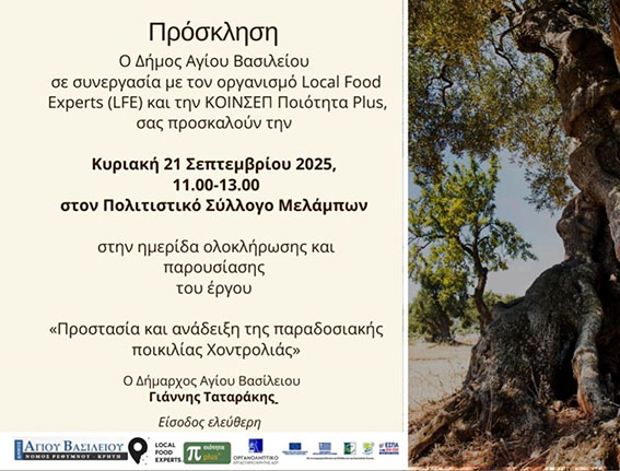 Ο Δήμος Αγίου Βασιλείου, σε συνεργασία με τον οργανισμό Local Food Experts (LFE) και την ΚΟΙΝΣΕΠ Ποιότητα Plus, διοργανώνει ημερίδα ολοκλήρωσης και παρουσίασης του έργου «Προστασία και ανάδειξη της παραδοσιακής ποικιλίας Χοντρολιάς».
