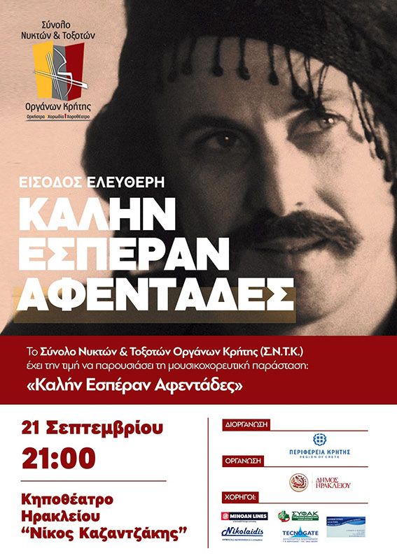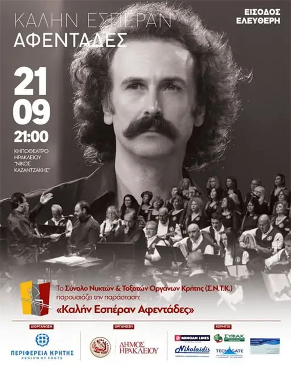 Το Σύνολο Νυκτών και Τοξοτών Οργάνων Κρήτης (Σ.Ν.Τ.Κ.) παρουσιάζει στο Κηποθέατρο «Νίκος Καζαντζάκης» την παράσταση «Καλήν Εσπέραν Αφεντάδες», μια μουσική βραδιά αφιερωμένη στον αξέχαστο Νίκο Ξυλούρη. Η εκδήλωση θα πραγματοποιηθεί την