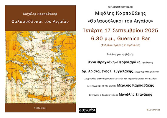 Οι Εκδόσεις Ραδάμανθυς παρουσιάζουν στο Ηράκλειο το βιβλίο του καπετάν Μιχάλη Καρπαθάκη, με τίτλο «Θαλασσόλυκοι του Αιγαίου». Η εκδήλωση θα γίνει την
