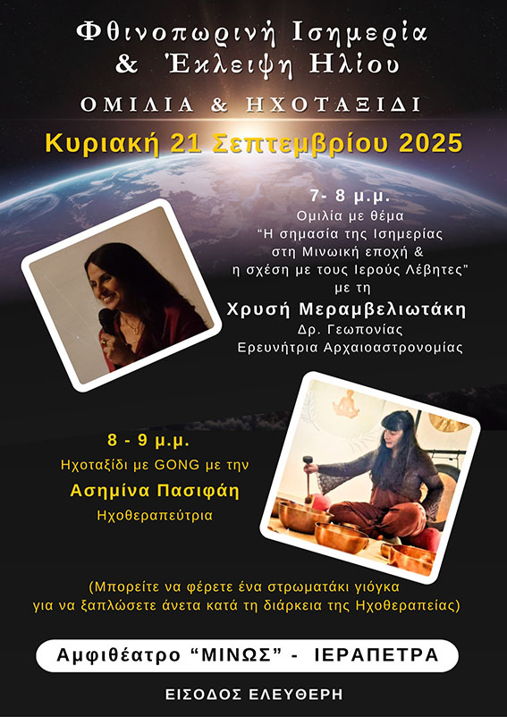 Την Κυριακή 21 Σεπτεμβρίου 2025, μία ημέρα πριν από τη φθινοπωρινή ισημερία, θα πραγματοποιηθεί μια ξεχωριστή εκδήλωση στο Αμφιθέατρο «Μίνως» στην Ιεράπετρα.