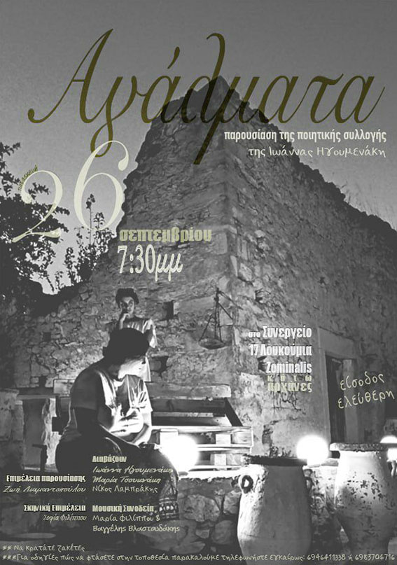 Στις απαγγελίες, οι φωνές της Μαρίας Τσουκνάκη, του Νίκου Λαμπράκη και της Ιωάννας Ηγουμενάκη θα δώσουν πνοή στους στίχους.