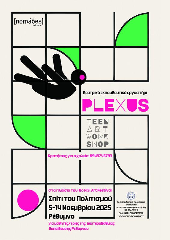 Το καλλιτεχνικό εργαστήρι Plexus επιχορηγείται από το ΥΠΠΟΑ, στο πλαίσιο του Προγράμματος ‘’Δημιουργική Ελλάδα – Επιχορηγήσεις Σύγχρονου Πολιτισμού 2025’’ για “Πολιτιστικές δράσεις και προγράμματα που απευθύνονται σε παιδιά και εφήβους” και προσφέρεται ΔΩΡΕΑΝ στους μαθητές γυμνασίου και λυκείου του νομού Ρεθύμνης.