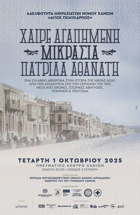 Η Αδελφότητα Μικρασιατών Ν. Χανίων «Ο Άγιος Πολύκαρπος», σε συνδιοργάνωση με την Περιφέρεια Κρήτης – Περιφερειακή Ενότητα Χανίων, τον Δήμο Χανίων, το ΚΑΜ και τον Ελληνικό Ερυθρό Σταυρό, διοργανώνει μια σπουδαία επετειακή εκδήλωση μνήμης με τίτλο: