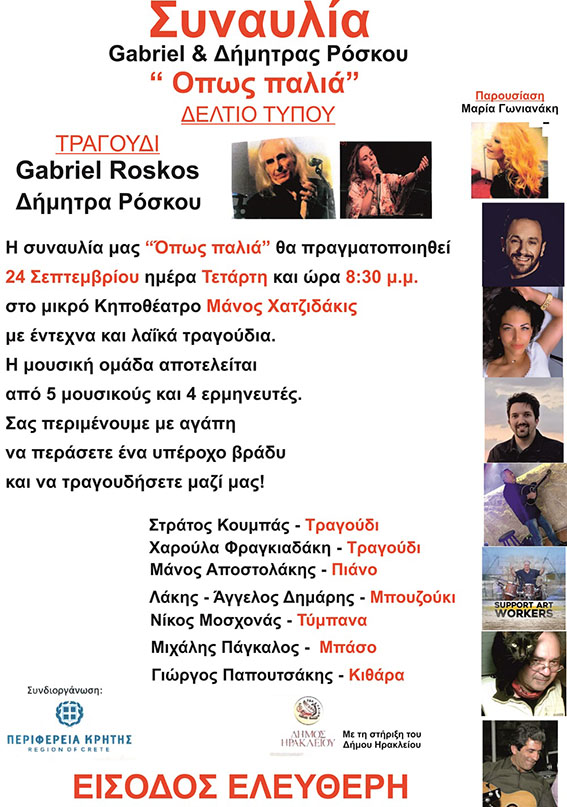 Η είσοδος είναι ελεύθερη για το κοινό. Οι Gabriel και Δήμητρα Ρόσκου θα μας ταξιδέψουν με έντεχνα και λαϊκά τραγούδια, σε ήχους και μελωδίες που ξυπνούν μνήμες, γεμίζουν συναισθήματα και μας φέρνουν πιο κοντά.