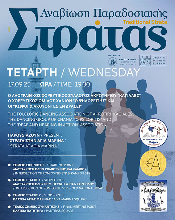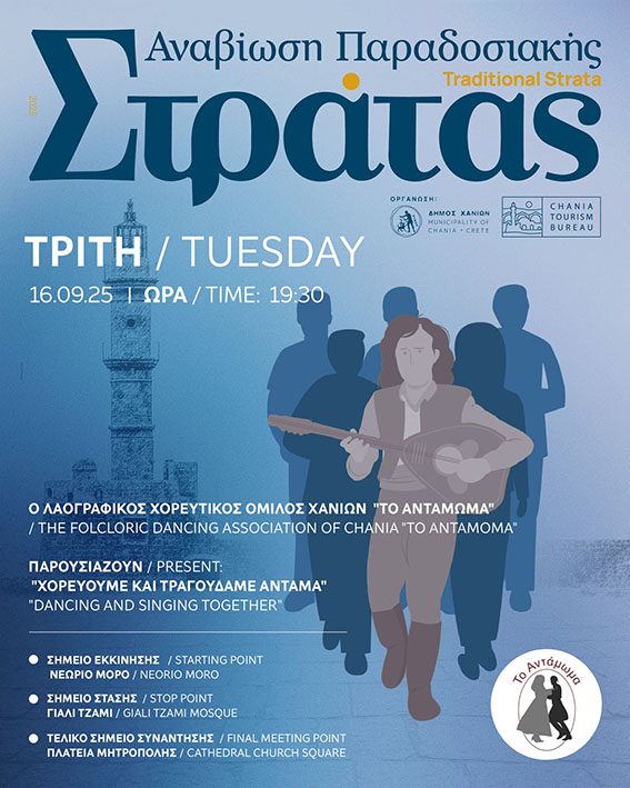 Συνεχίζεται η Παραδοσιακή Στράτα του Δήμου Χανίων – Αύριο, Τρίτη 16/09, με τον Λαογραφικό Χορευτικό Όμιλο Χανίων «Το Αντάμωμα» & την Τετάρτη 17/09 με τους Παραδοσιακούς Συλλόγους στην Αγία Μαρίνα.