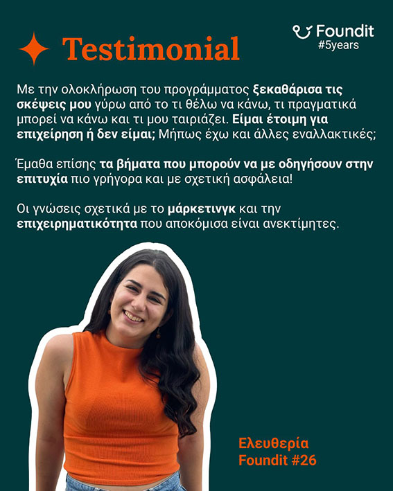Επιπλέον, τα άτομα που συμμετέχουν στο Foundit γίνονται μέλη της κοινότητα του προγράμματος, συμμετέχουν σε δωρεάν, εξειδικευμένα online webinar και workshop.