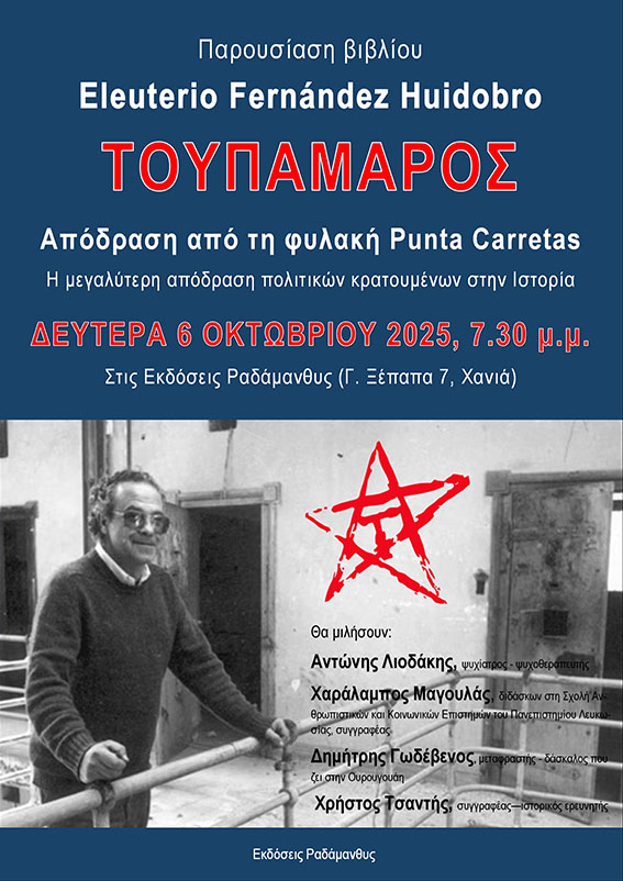 Οι Εκδόσεις Ραδάμανθυς παρουσιάζουν για πρώτη φορά στην Ελλάδα το βιβλίο του αγωνιστή των Τουπαμάρος Eleuterio Fernández Huidobro με τίτλο «Τουπαμάρος – Απόδραση από τη φυλακή Punta Carretas», τη