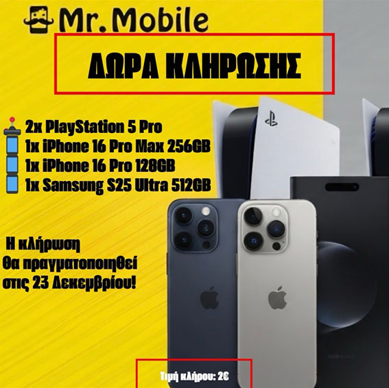 Η γιορτή των 5 χρόνων Mr Mobile Ρεθύμνο συνεχίζεται με μια μεγάλη κλήρωση που θα κορυφωθεί στις 23 Δεκεμβρίου 2025!
