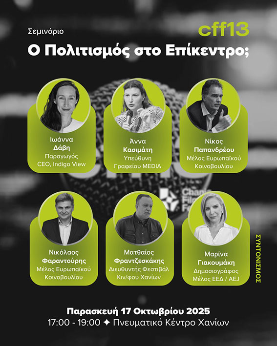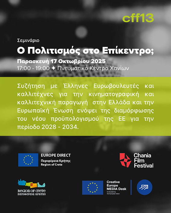 Στο πλαίσιο του Ευρωπαϊκού έργου Europe Direct, το Europe Direct της Περιφέρειας Κρήτης, το 13ο Φεστιβάλ Κινηματογράφου Χανίων (15-26 Οκτωβρίου 2025) και το Πρόγραμμα Δημιουργική Ευρώπη – Υποπρόγραμμα MEDIA στην Ελλάδα συνδιοργανώνουν ένα διαδραστικό σεμινάριο με τίτλο:
