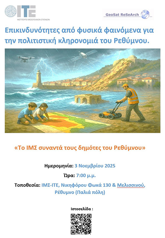 Ομιλητής θα είναι ο Δρ. Νάσος Αργυρίου, Ερευνητής Γ΄ στο ΙΜΣ-ΙΤΕ, ο οποίος θα αναπτύξει το κρίσιμο θέμα «Επικινδυνότητες από φυσικά φαινόμενα για την πολιτιστική κληρονομιά του Ρεθύμνου»