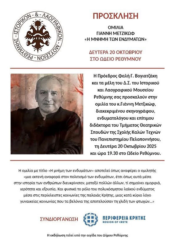 Παράλληλα, ο κ. Μετζικώφ θα αναφερθεί στο πώς η ενδυματολογία διαμόρφωσε την ταυτότητα των ανθρώπων μέσα στις περιπλοκές κοινωνίες της παλαιάς Κρήτης, αλλά και πώς η παραδοσιακή γυναικεία κοινωνία, μέσω των βελονιών της, αποτέλεσε τη «χλίδα των φτωχών».