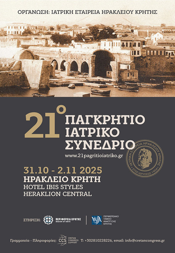 Το 21ο Παγκρήτιο Ιατρικό Συνέδριο, που διοργανώνεται από την Ιατρική Εταιρεία Ηρακλείου, θα πραγματοποιηθεί στο ξενοδοχείο Ibis Styles Heraklion Central, από