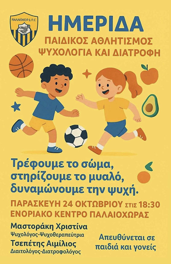 Μια ιδιαίτερα ενδιαφέρουσα ημερίδα αφιερωμένη στον παιδικό αθλητισμό, την ψυχολογία και τη διατροφή διοργανώνει η ομάδα Παλαιόχωρα F.C., την