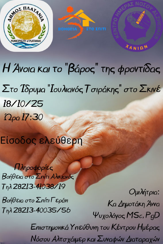 Το Πρόγραμμα “Βοήθεια στο Σπίτι” του Δήμου Πλατανιά, σε συνεργασία με το Κέντρο Ημέρας Νόσου Alzheimer και Συναφών Διαταραχών Χανίων, σας προσκαλούν το