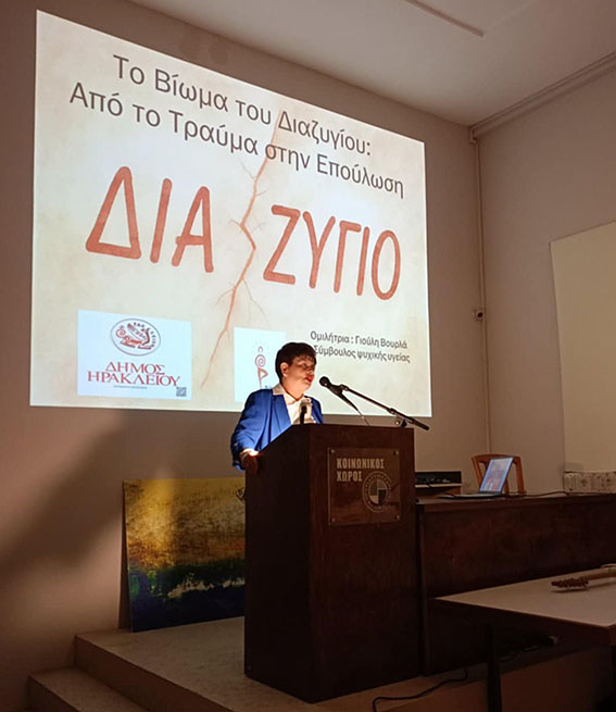 η ομιλία με θέμα «Το Βίωμα του Διαζυγίου – Από το Τραύμα στην Επούλωση», που διοργάνωσε η Αντιδημαρχία Εθελοντισμού του Δήμου Ηρακλείου σε συνεργασία με τη Σύμβουλο Ψυχικής Υγείας Γιούλη Βουρλά, στον Κοινωνικό Χώρο των Ιδρυμάτων Καλοκαιρινού.