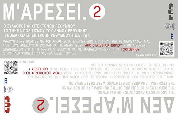 Είκοσι χρόνια μετά την πρώτη διοργάνωση, ο Σύλλογος Αρχιτεκτόνων Ρεθύμνου επανέρχεται με μια ξεχωριστή δράση που συνδυάζει την τέχνη, την αρχιτεκτονική και τη ματιά των ίδιων των πολιτών. Με τίτλο «Μ’ αρέσει – δε μ’ αρέσει 2», ο Σύλλογος προσκαλεί τους κατοίκους του Ρεθύμνου να εκφράσουν μέσα από φωτογραφίες τι τους αρέσει και τι όχι από το φυσικό και δομημένο περιβάλλον του τόπου μας.