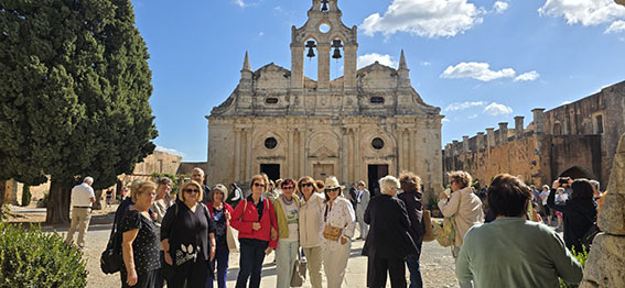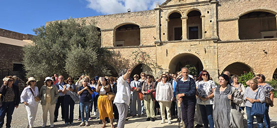 Στην Ιερά Μονή Αρκαδίου, οι συμμετέχοντες είχαν την ευκαιρία να γνωρίσουν από κοντά τους χώρους του μοναστηριού και να ακούσουν, μέσα από τις εμπνευσμένες αφηγήσεις της Αθηνάς Κυριακάκη-Σφακάκη, για την ιστορία, τη θυσία και τη διαχρονική πνευματική αξία του τόπου.