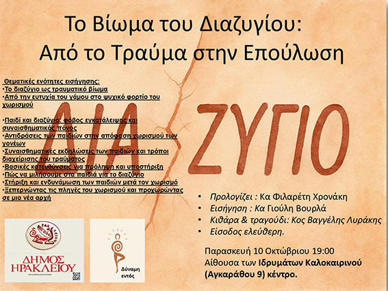 Ομιλία με θέμα «Το Βίωμα του Διαζυγίου-Από το Τραύμα στην Επούλωση» διοργανώνει η Αντιδημαρχία Εθελοντισμού του Δήμου Ηρακλείου σε συνεργασία με τη Σύμβουλο Ψυχικής Υγείας Γιούλη Βουρλά την