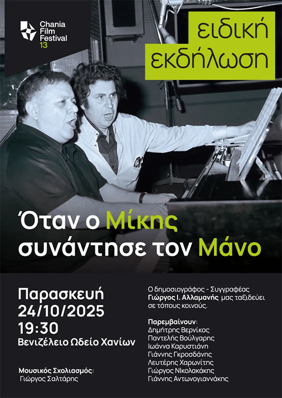 Το 13ο Φεστιβάλ Κινηματογράφου Χανίων τιμά δύο κορυφαίες μορφές του ελληνικού πολιτισμού, τον Μίκη Θεοδωράκη και τον Μάνο Χατζιδάκι, με αφορμή τη συμπλήρωση 100 χρόνων από τη γέννησή τους, μέσα από μια ιδιαίτερη εκδήλωση που θα πραγματοποιηθεί την