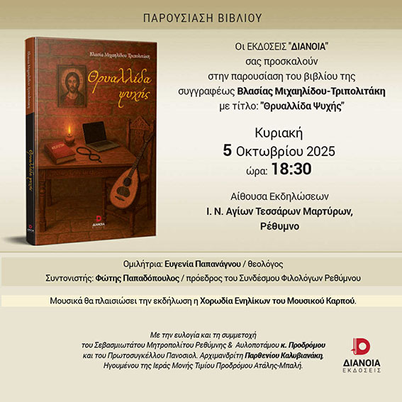 Οι Εκδόσεις ΔΙΑΝΟΙΑ προσκαλούν το κοινό στην παρουσίαση του νέου βιβλίου της συγγραφέως Βλασίας Μιχαηλίδου – Τριπολιτάκη με τίτλο «Θρυαλλίδα Ψυχής», την