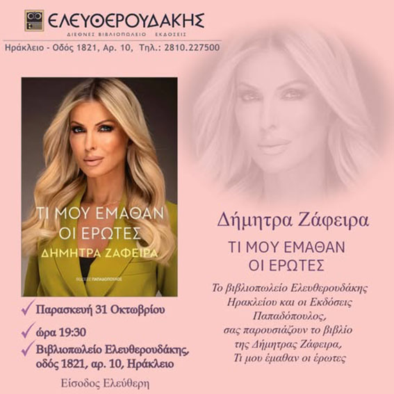 Το βιβλιοπωλείο «Ελευθερουδάκης» (οδός 1821 αρ. 10, Ηράκλειο), θα παρουσιαστεί το νέο βιβλίο της κλινικής ψυχολόγου Δήμητρας Ζάφειρα με τίτλο «Τι μου έμαθαν οι έρωτες» την