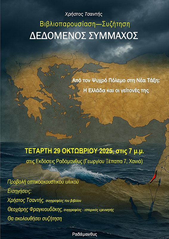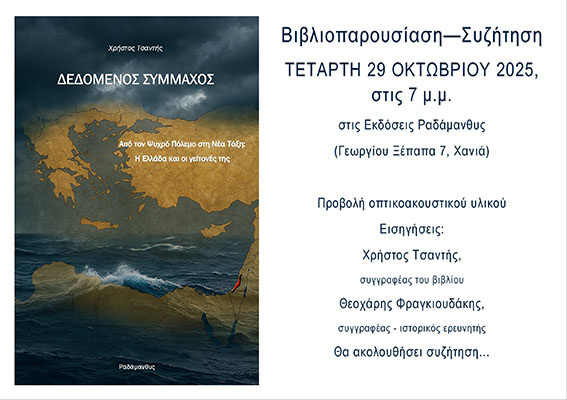 στις 7 το απόγευμα, στον χώρο των εκδόσεων (Γεωργίου Ξέπαπα 7, Χανιά), το νέο ιστορικό δοκίμιο του Χρήστου Τσαντή με τίτλο