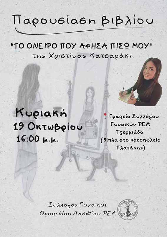 Ο Σύλλογος Γυναικών Οροπεδίου Λασιθίου “Ρέα” διοργανώνει την παρουσίαση του βιβλίου «Το όνειρο που άφησα πίσω μου» της Χριστίνας Κατσαράκη.