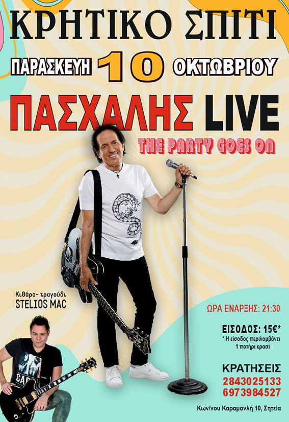στο φιλόξενο “Κρητικό Σπίτι”, θα παρουσιαστεί η μουσική παράσταση με τίτλο “The Party Goes On”, μια βραδιά που υπόσχεται ασταμάτητο κέφι και επιτυχίες που όλοι αγαπήσαμε.