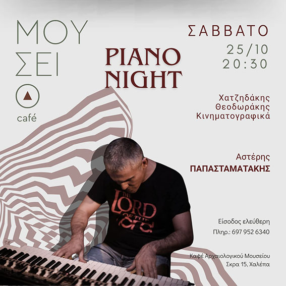 Το Σάββατο 25 Οκτωβρίου στις 20:30 το Καφέ Αρχαιολογικού Μουσείου Χανίων θα φιλοξενήσει τον Αστέριο Παπασταματάκη σε μία βραδιά πιάνου.