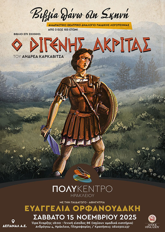 η Ευαγγελία Ορφανουδάκη παρουσιάζει το έργο του Ανδρέα Καρκαβίτσα «Διγενής Ακρίτας», μέσα από ένα θεατρικό αναλόγιο που ενώνει τη λογοτεχνία με τη σκηνική αφήγηση.