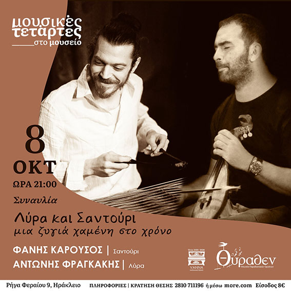 Στη σκηνή του «Θύραθεν» θα συναντηθούν ο Αντώνης Φραγκάκης (λύρα) και ο Φάνης Καρούσος (σαντούρι), για να αναβιώσουν έναν παλιό, σχεδόν λησμονημένο ήχο.