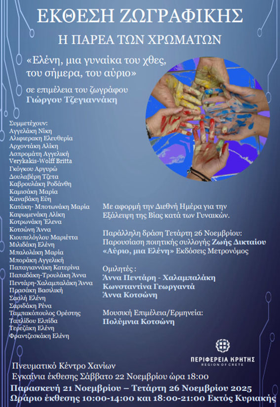 Με αφορμή τη Διεθνή Ημέρα για την Εξάλειψη της Βίας κατά των Γυναικών, η Περιφέρεια Κρήτης – Περιφερειακή Ενότητα Χανίων, το Πνευματικό Κέντρο Χανίων και οι Εκδόσεις Μετρονόμος διοργανώνουν την έκθεση ζωγραφικής της ομάδας