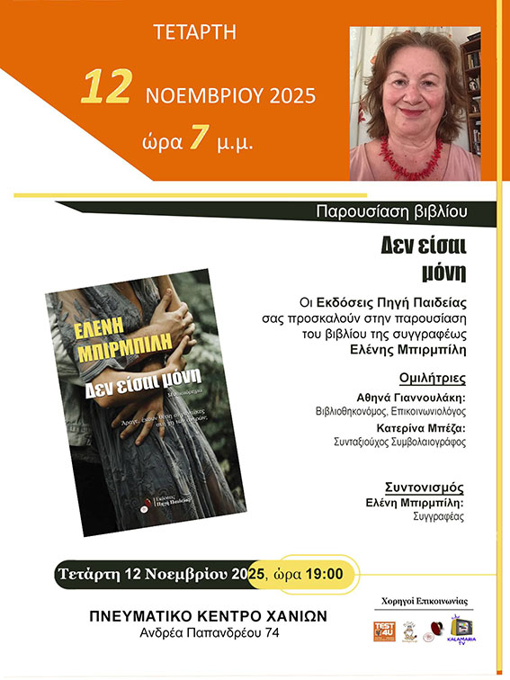 Μια ζεστή και ουσιαστική λογοτεχνική βραδιά υπόσχεται η παρουσίαση του νέου βιβλίου της Ελένης Μπιρμπίλη με τίτλο «Δεν είσαι μόνη», που θα πραγματοποιηθεί την