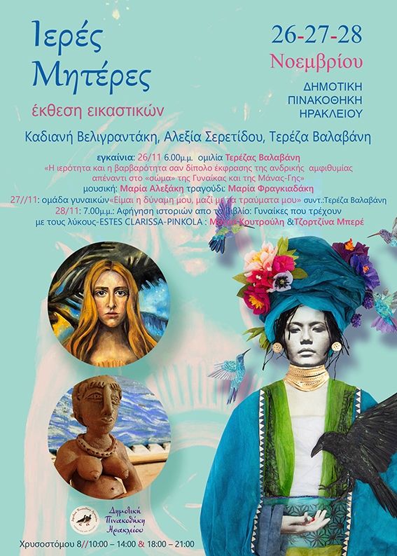 Η Δημοτική Πινακοθήκη Ηρακλείου (Χρυσοστόμου 8) υποδέχεται την εικαστική έκθεση “Ιερές Μητέρες”, ένα τριήμερο αφιερωμένο στη δύναμη, την ιερότητα και τη θεραπευτική ενέργεια της θηλυκής αρχής, όπως εκφράζεται μέσα από το έργο των Καδιανής Βελιγραντάκη, Αλέξιας Σερετίδου και Τερέζας Βαλαβάνη.