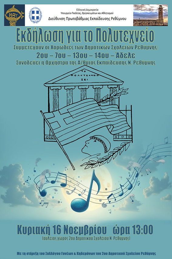στον αύλειο χώρο του 2ου Δημοτικού Σχολείου Ρεθύμνου, ώστε όλοι μαζί να τιμήσουμε τη μνήμη των αγωνιστών του Πολυτεχνείου και να επαναβεβαιώσουμε τη δέσμευσή μας για μια ελεύθερη και δημοκρατική κοινωνία.