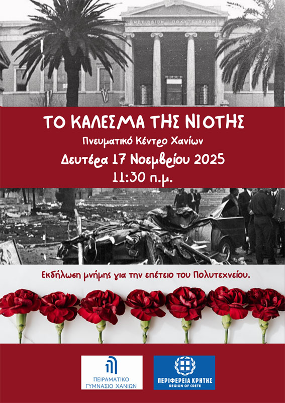 Σε συνδιοργάνωση με την Περιφέρεια Κρήτης – Περιφερειακή Ενότητα Χανίων, οι μαθητές, οι εκπαιδευτικοί και η τοπική κοινωνία ενώνουν τις φωνές τους σε μια παρουσίαση αφιερωμένη στα ιδανικά, τα οράματα και το θάρρος των νέων που σημάδεψαν την Ιστορία.