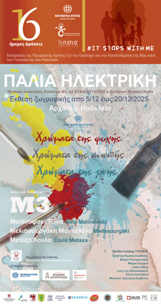 Με βαθιά συγκίνηση και ιδιαίτερη τιμή, Κολεκτίβ Μ3 – μία δυναμική συνένωση τριών εικαστικών καλλιτεχνίδων από δύο χώρες και διαφορετικές γενιές – σας προσκαλεί στην πρώτη της κοινή έκθεση ζωγραφικής, η οποία πραγματοποιείται στο πλαίσιο της συνεργασίας Πολωνίας-Ελλάδας .
