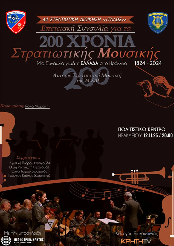 Η 44 Στρατιωτική Διοίκηση “ΤΑΛΩΣ” τιμά τη συμπλήρωση 200 ετών από την ίδρυση της Στρατιωτικής Μουσικής του Ελληνικού Στρατού (1824–2024) με μια επετειακή συναυλία – αφιέρωμα, την