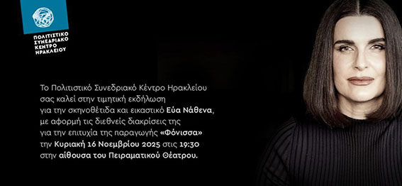 στις 19:30, στην αίθουσα του Πειραματικού θέατρου, του Πολιτιστικού Συνεδριακού Κέντρου Ηρακλείου, στο πλαίσιο του κύκλου «Πρόσωπα και Ιδέες», με αφορμή τις διεθνείς διακρίσεις της για την επιτυχημένη ταινία «Φόνισσα», που έχει ξεχωρίσει σε φεστιβάλ σε όλο τον κόσμο.