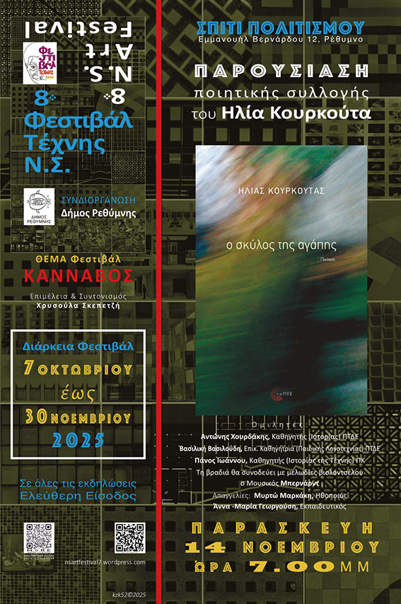 στις 19:00, στο Σπίτι του Πολιτισμού, την παρουσίαση της ποιητικής συλλογής του Ηλία Κουρκούτα με τίτλο