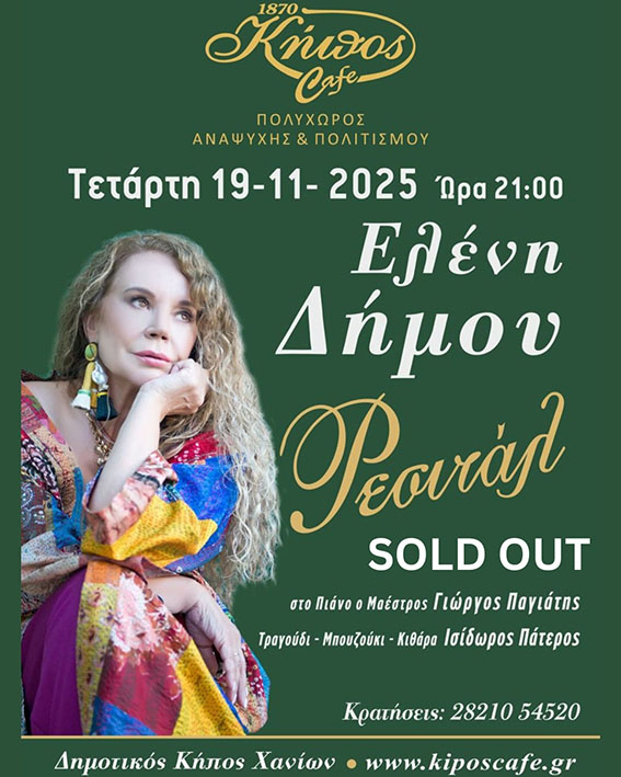 Την Τετάρτη 19 Νοεμβρίου στις 21:00, το αγαπημένο Καφέ «Κήπος» υποδέχεται μία από τις πιο χαρακτηριστικές φωνές του ελληνικού τραγουδιού, την Ελένη Δήμου, για μια ξεχωριστή συναυλία που υπόσχεται έντονο συναίσθημα, νοσταλγία και στιγμές που θα μείνουν αξέχαστες.