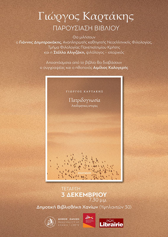 Ο Δήμος Χανίων, η Δημοτική Βιβλιοθήκη Χανίων, το βιβλιοπωλείο Librairie και οι εκδόσεις ΕΝΔΥΜΙΩΝ προσκαλούν το κοινό σε μια ξεχωριστή λογοτεχνική βραδιά αφιερωμένη στο νέο βιβλίο του Γιώργου Καρτάκη με τίτλο «Πατριδογνωσία».