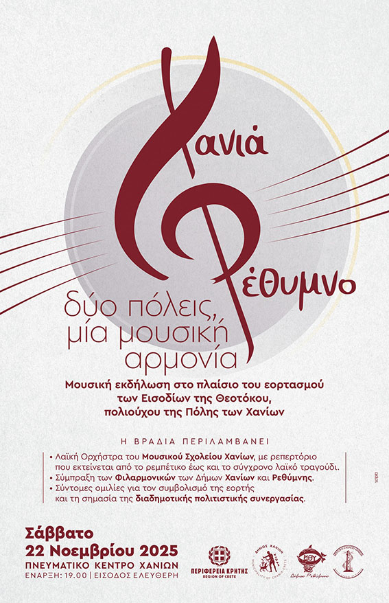 Η Περιφέρεια Κρήτης – Περιφερειακή Ενότητα Χανίων, σε συνδιοργάνωση με τον Δήμο Χανίων, τον Δήμο Ρεθύμνου και το Μουσικό Σχολείο Χανίων, παρουσιάζει την εκδήλωση «Δύο Πόλεις, Μία Μουσική Αρμονία»: ένα πολιτιστικό γεγονός που αναδεικνύει τον κοινό παλμό και τη μουσική ταυτότητα της Δυτικής Κρήτης.
