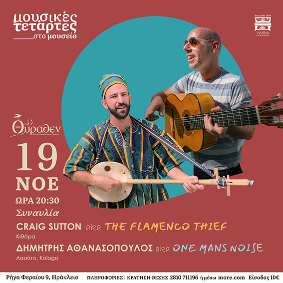 Ο χώρος του Μουσείου Θύραθεν υποδέχεται δύο καλλιτέχνες που συναντιούνται στη σκηνή για μια ιδιαίτερη μουσική εμπειρία. Ο Craig Sutton – διεθνώς γνωστός ως «The Flamenco Thief» – φέρνει στο Ηράκλειο τη μοναδική του τεχνική, μεταμορφώνοντας την κιθάρα σε ένα ολόκληρο μουσικό σύνολο.