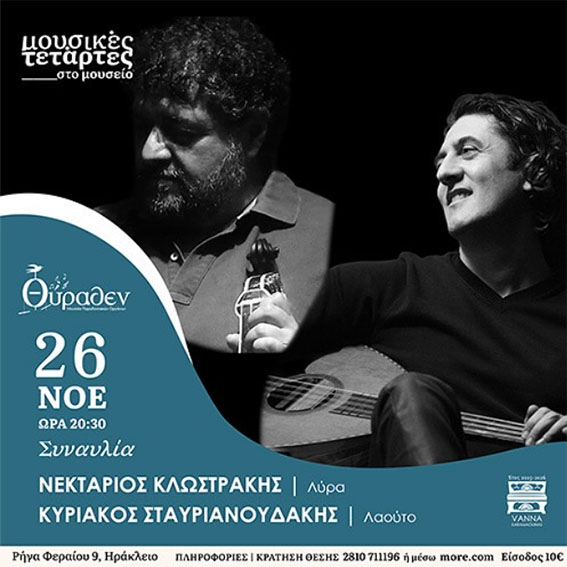 στις 20:30, στο Μουσείο Θύραθεν, με πρωταγωνιστές τον Νεκτάριο Κλωστράκη στη λύρα και τον Κυριάκο Σταυριανουδάκη στο λαούτο.