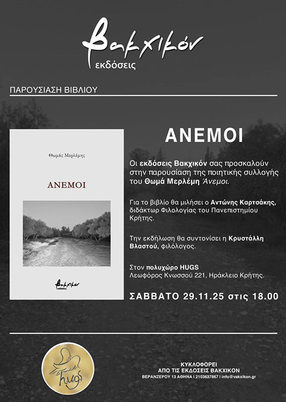 Η νέα ποιητική συλλογή «Άνεμοι» του Θωμά Μερλέμη παρουσιάζεται στο Ηράκλειο το