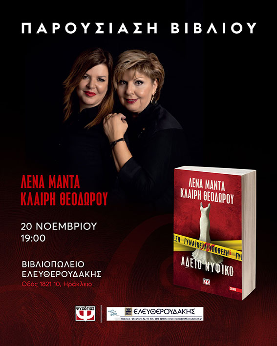Το βιβλιοπωλείο Ελευθερουδάκης Ηρακλείου και οι Εκδόσεις Ψυχογιός σας προσκαλούν στην παρουσίαση του νέου βιβλίου των συγγραφέων Λένας Μαντά και Κλαίρης Θεοδώρου, με τίτλο «Γυναικεία Υπόθεση 5 – Άδειο Νυφικό».